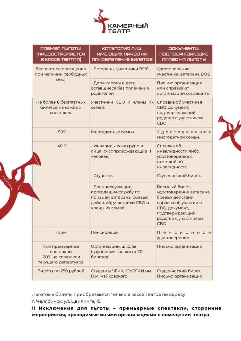 Количество льготных мест устанавливается театром самостоятельно в отношении каждого спектакля. Согласно «Положению о правилах продажи и возврата театр. билетов и посещения ОГБУК ЧГДКТ от 24.11.2025» ниже представлен перечень льгот: