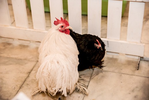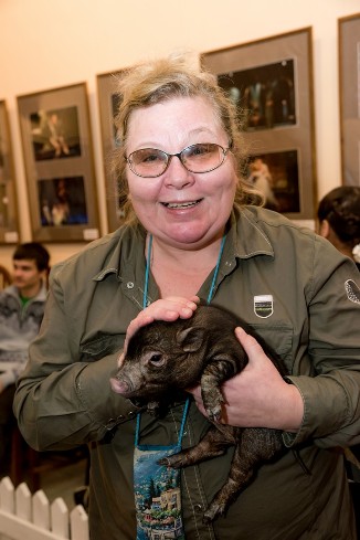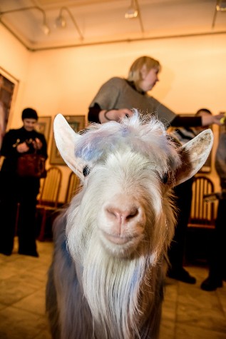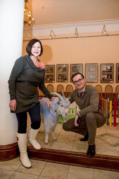 В юбилейный вечер благодаря поддержке Контактного зоопарка города в фойе театра расположился своеобразный «скотный двор». На нем в специальных вольерах разместились знакомые домашние животные – петухи, поросята, кролики и замечательной красоты голубой козленок.