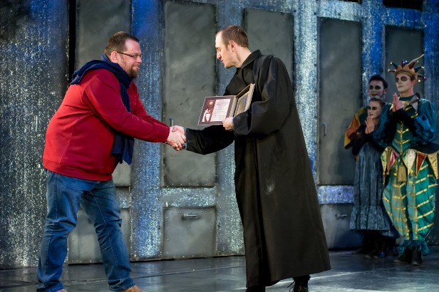 Главный режиссер НХТ Евгений Гельфонд вручил театру Диплом участника фестиваля. От актеров, занятых в спектакле его получал исполнитель главной роли Дмитрий Олейников.