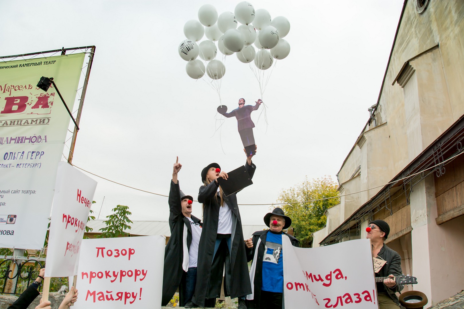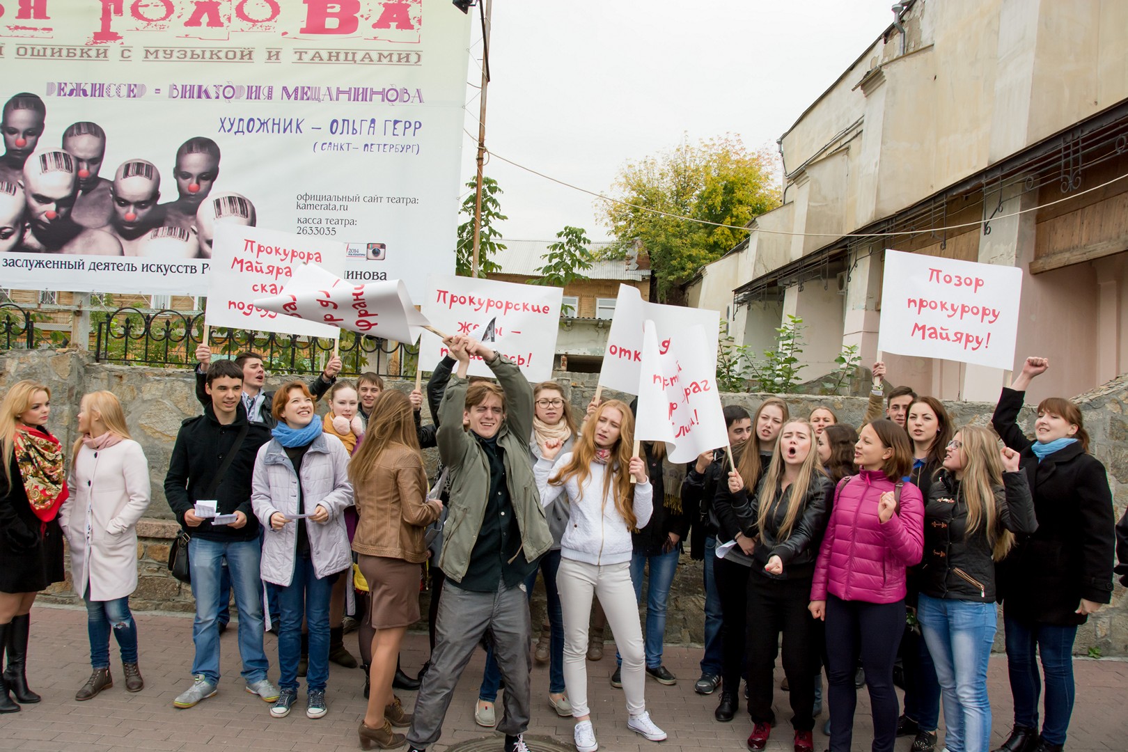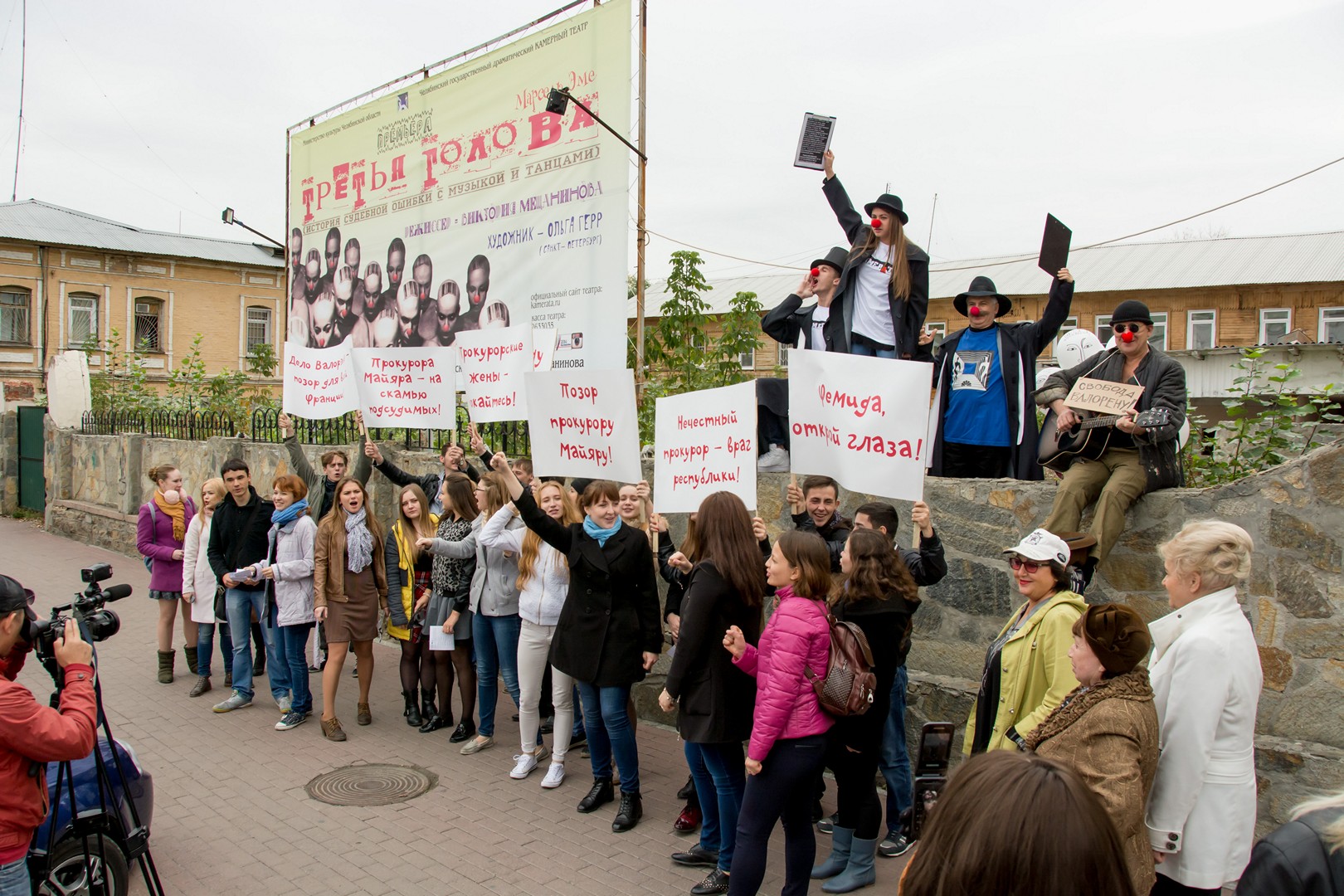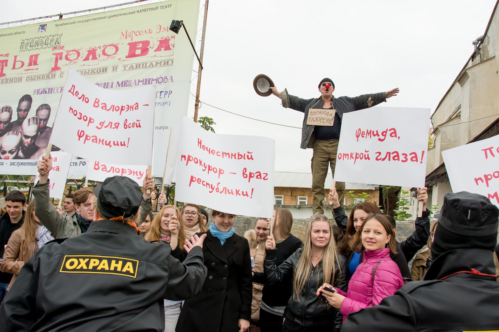 25 сентября перед Камерным театром прошла массовая акция в защиту несправедливо приговоренного к смерти джазового музыканта Валорэна, главного героя спектакля «Третья голова», премьера которого состоится на следующий день, 26 сентября.