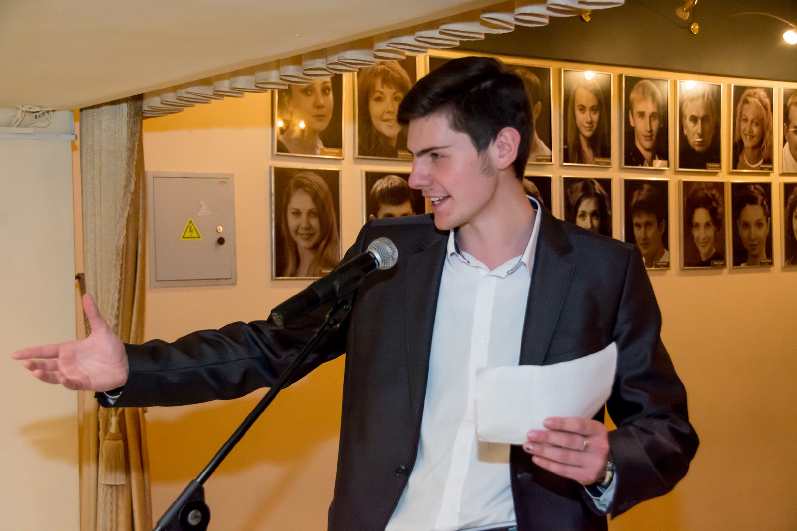 До начала спектакля «Свободным микрофоном» в фойе воспользовались и молодые зрители. На небольшую сцену один за другим выходили студенты с чтением любимых стихов поэта. Среди них – и подопечные главного режиссера Камерного театра Виктории Мещаниновой, студенты третьего курса актерского отделения театрального факультета ЧГАКИ. Кто знает, может в скором времени, и их фотографии будут украшать портретный стенд актеров Камерного.