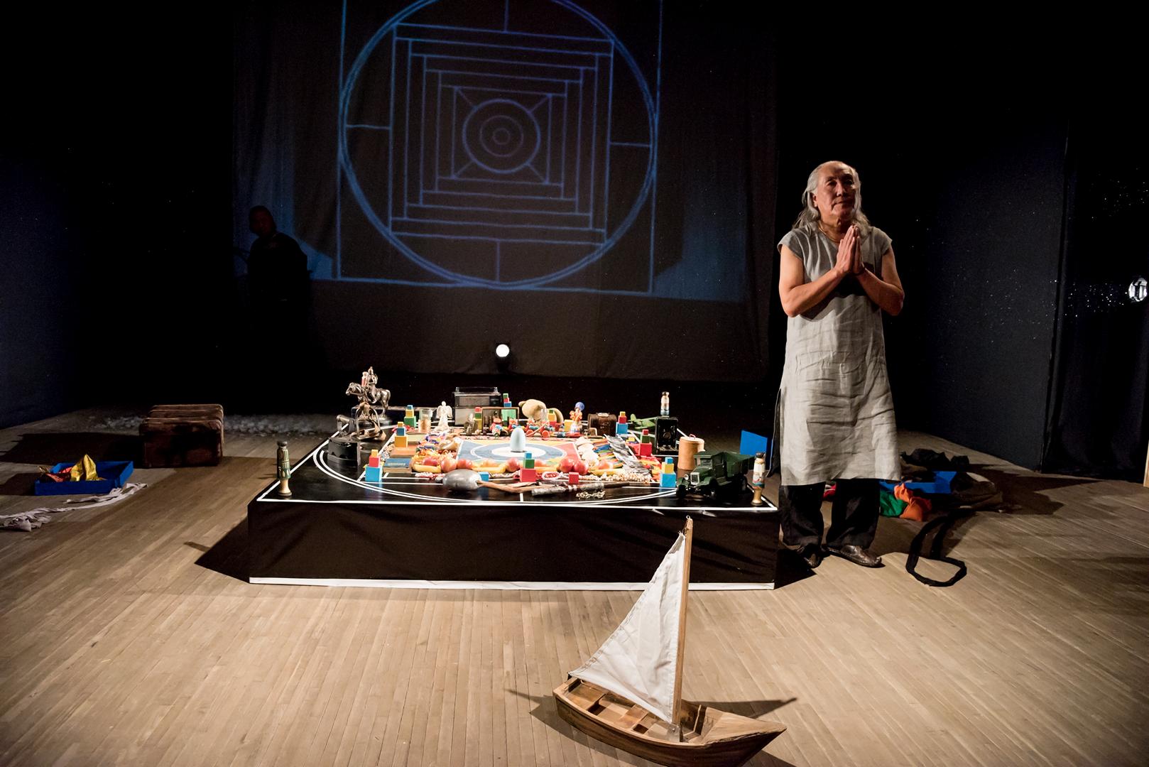 А еще на сцене – мандала, ячейки которой по ходу действия актер заполняет игрушками, книгами, фруктами, многочисленными предметами, сопровождающими человека на протяжении его жизни, составляющими космос этой жизни.