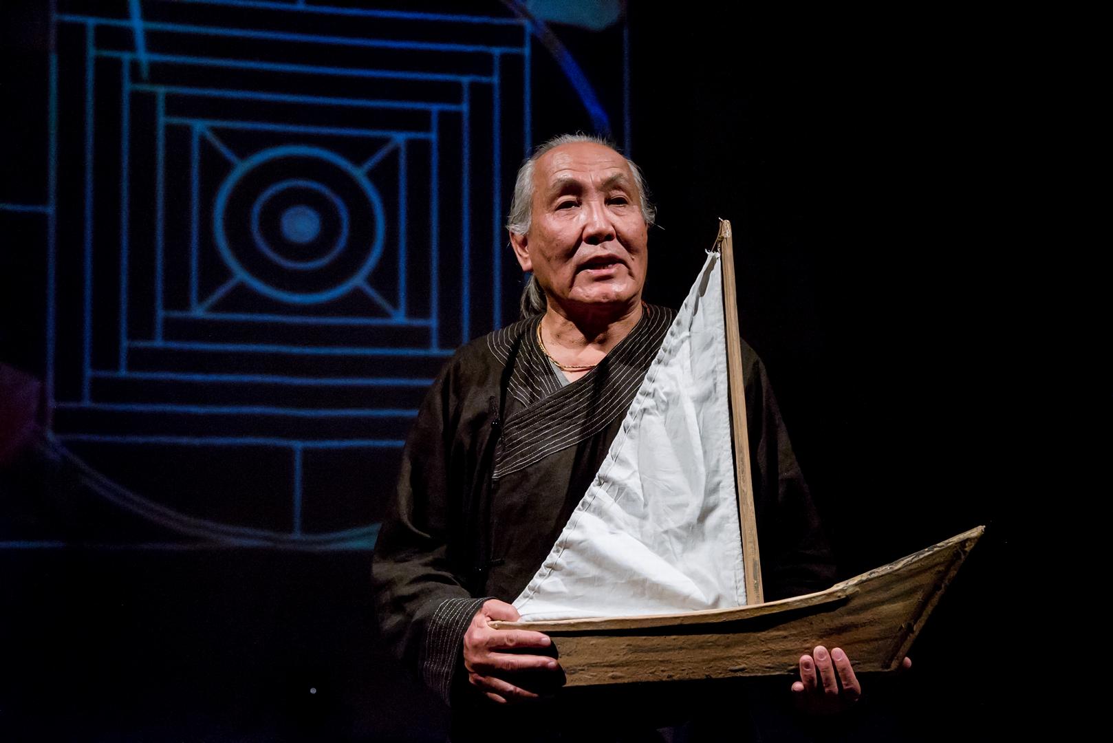 История старика Сантьяго, давно забывшего о рыбацкой удаче, отправившегося в море, чтобы поймать самую большую в жизни рыбу, рассказана режиссером Олегом Юмовым уже второй раз. Первая версия была насыщена яркой зрелищностью – видео проекциями подводного мира, песком и обломками лодок, привезенными с побережья Байкала, многими действующими лицами. Теперь на сцене – один актер, нар. арт. Бурятии Баста Цыденов и музыкант, сопровождающий рассказ старика игрой на монгольском смычковом инструменте моринхуре, распространенном и в Бурятии.
