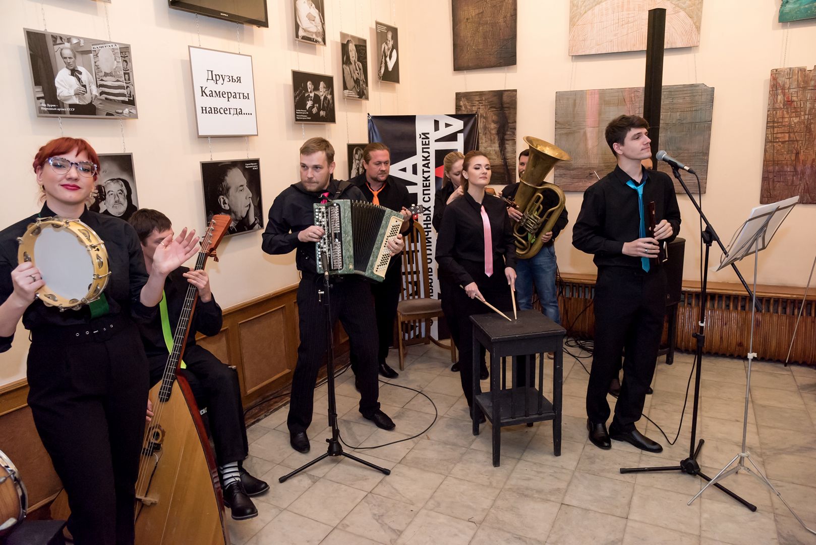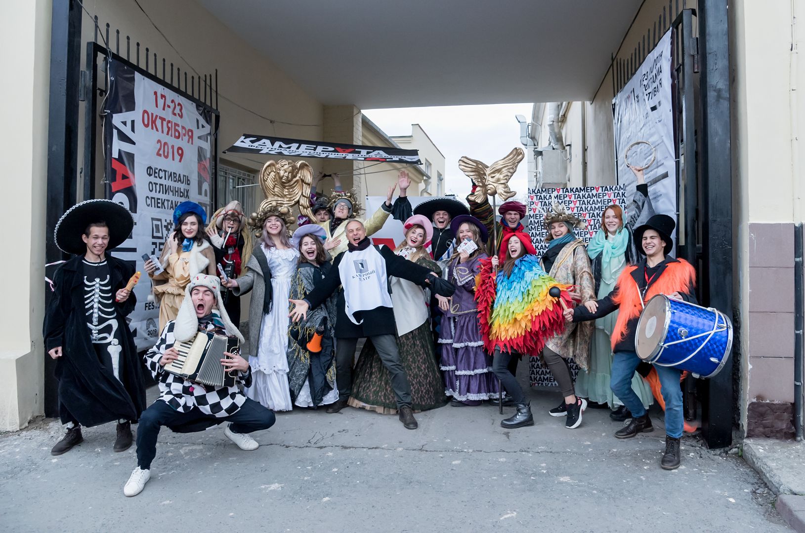 Примерно спустя час пёстрое шествие вернулось на исходный рубеж. Картинно «взяв штурмом» кованые театральные ворота, что тоже давно стало доброй традицией, процессия переместилась в фойе, где давно уже занял позиции оркестр Челябинского «Камерного театра». Это добровольцы из труппы Камерного, способные порадовать зрителя не только мощной актёрской игрой, но также игрой на разномастных музыкальных инструментах – от бубна и барабана до скрипки, аккордеона и даже экзотических народных инструментов.