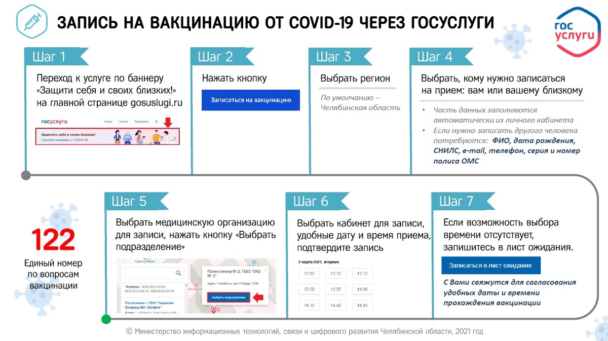 Удобнее записаться на вакцинацию через Госуслуги. Это можно сделать в любое время суток, не посещая медицинские учреждения, без очередей и потери времени. По данным Мининформа Челябинской области, количество зарегистрированных пользователей портала gosuslugi.ru составляет свыше 3,2 млн человек. Они имеют техническую возможность записаться на прививку в онлайн.