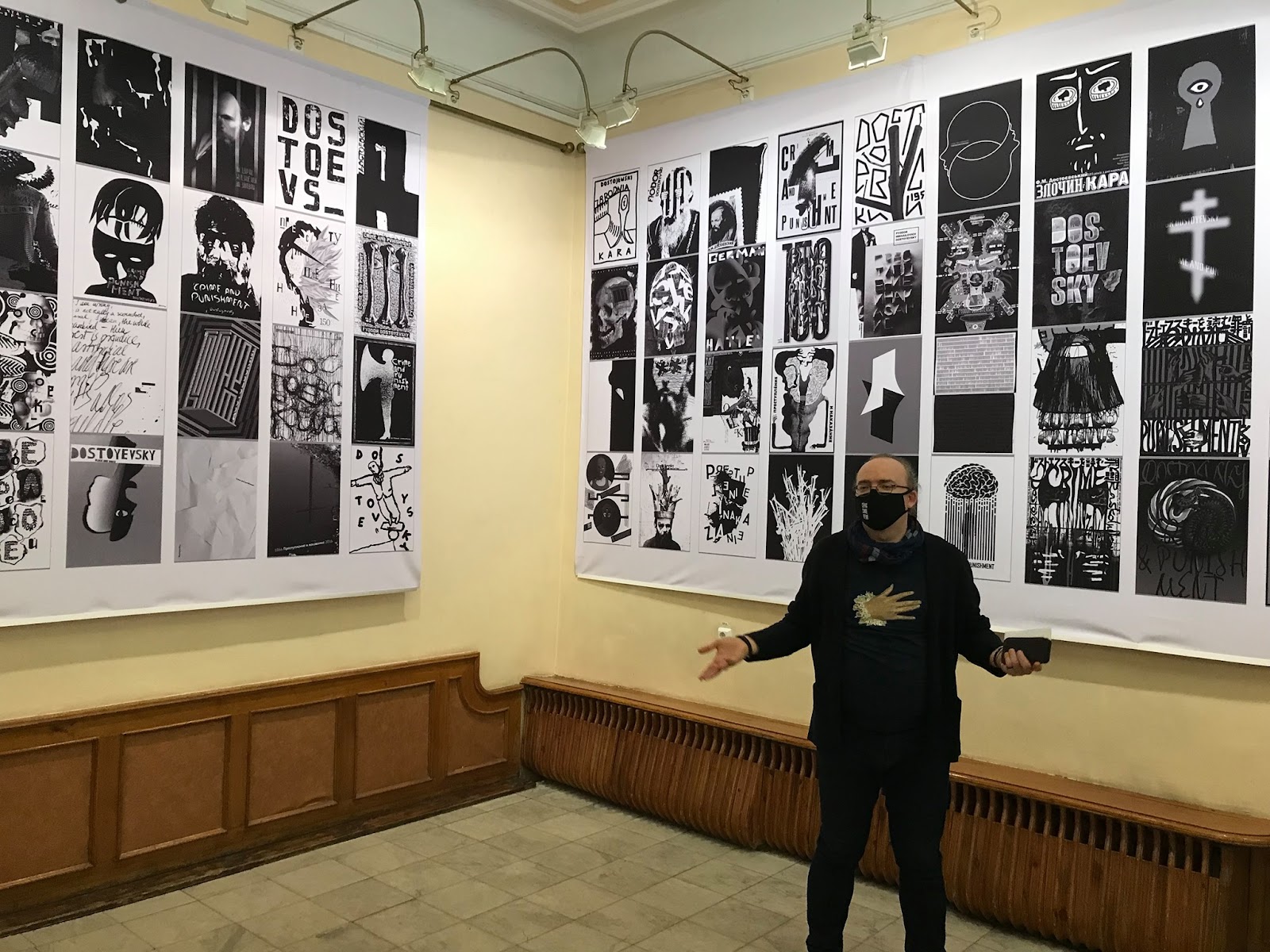 К фестивалю приурочена и новая выставка в фойе Камерного театра. Здесь представлены плакаты-финалисты акции «Достоевский. Черное и Белое», всемирного биеннале дизайна «Стрелка» (всего их 98). Работы экспонируются в Челябинске впервые, выставка организована при поддержке Челябинского регионального отделения Союза дизайнеров России. Об этом рассказал куратор выставки Павел Писклаков.