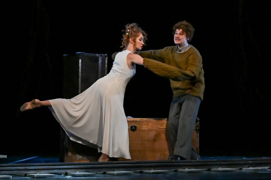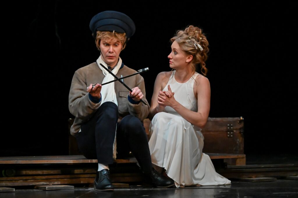 Артем Черкаев решает чеховскую историю как фарс. Алина Чернобровкина и Кирилл Фёдоров существуют в обострённо-космическом рисунке. Изогнутая пластика, метафоричное мрачное пространство, постоянно меняющаяся мелодика речи — всё это характеризует внебытовую форму спектакля.