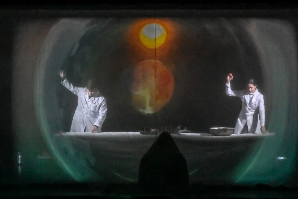 В глубине сцены двое актёров в медицинских халатах проводят эксперимент. То ли это современная, то ли божественная лаборатория — проращивают они не просто зерно, но новую жизнь.