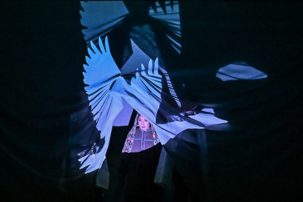 За полупрозрачным суперзанавесом Юлия Яркина воплощает сразу несколько сущностей. Она Мать-земля, прародительница, птица. Актриса появляется словно из ниоткуда, связывая собой мир прошлого и будущего. Все действия в лаборатории снимаются и транслируются на занавесе здесь и сейчас.
